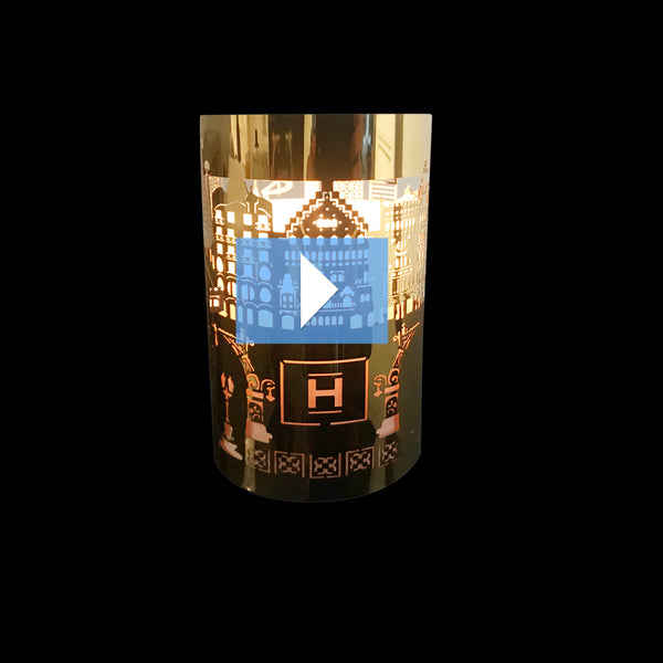 Se comisionó a una ilustradora local para hacer un dibujo representando muchos de los iconos de la ciudad que crean esa magia que solamente Barcelona tiene. La vela viene en un vaso de vidrio que entra dentro de un sobre-vaso metálico que lleva la ilustración calada para que cuando se enciende la vela se ilumine todo, pareciendo que por las ventanillas de todos los edificios hubiera una luz encendida.